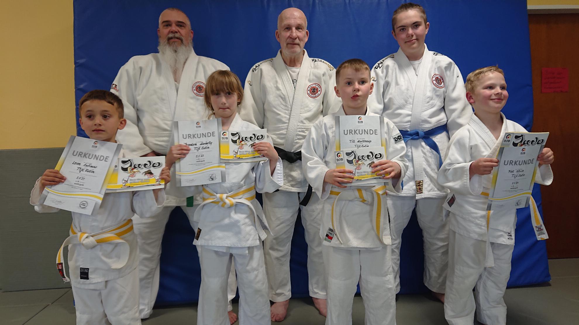 Über ihren weiß-gelben Gürtel (8. Kyu) freuen sich und die Trainer:
