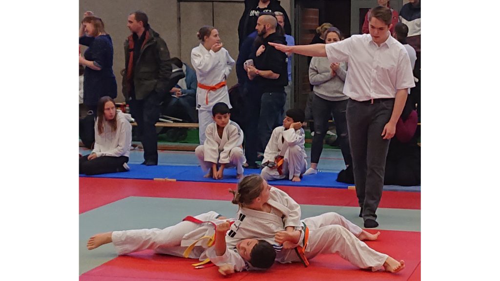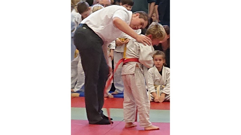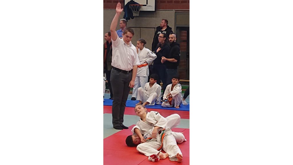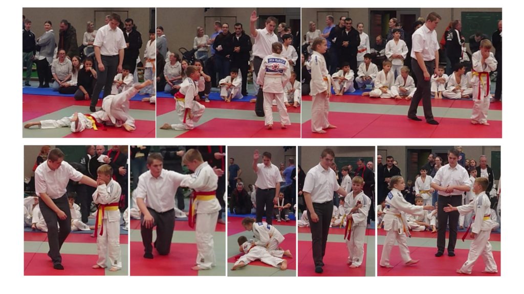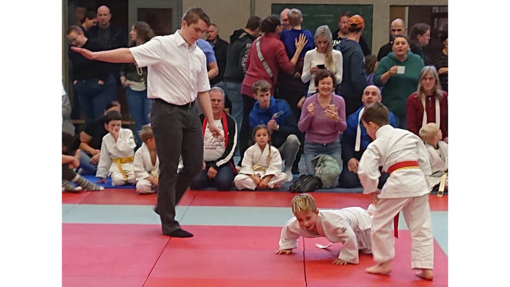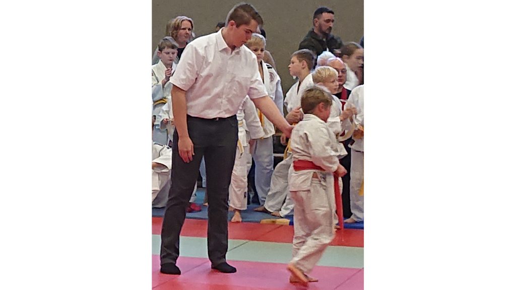 Behutsam und mit ganz viel Feingefühl leiteten sie die Kämpfe auf ihren Matten. Dabei galt es gerade bei den Kleinen, so manche Träne zu trocknen oder auch die Wettkampfregeln im Einzelnen zu erläutern ohne dabei gleich mit einem Shido (Strafe) aufzuwarten. Oft musste auch beim Gürtelbinden unterstützt und das korrekte Betreten und Verlassen der Wettkampffläche wiederholt werden.