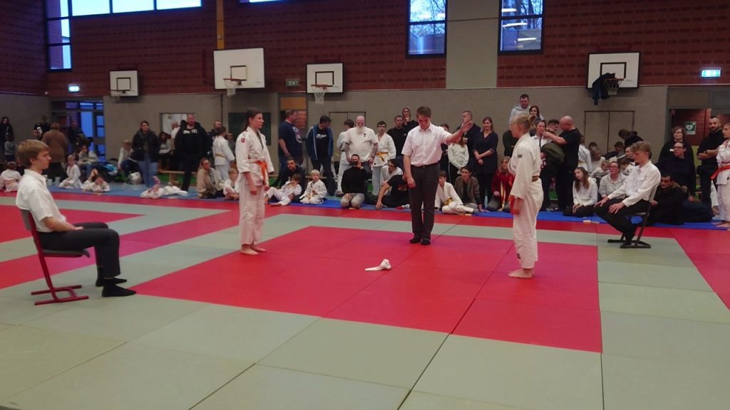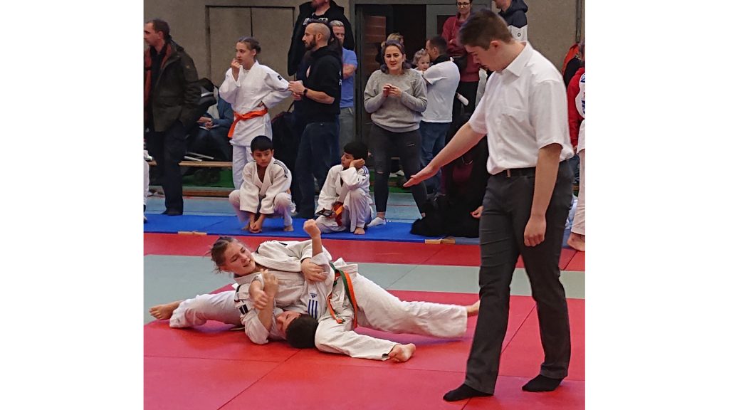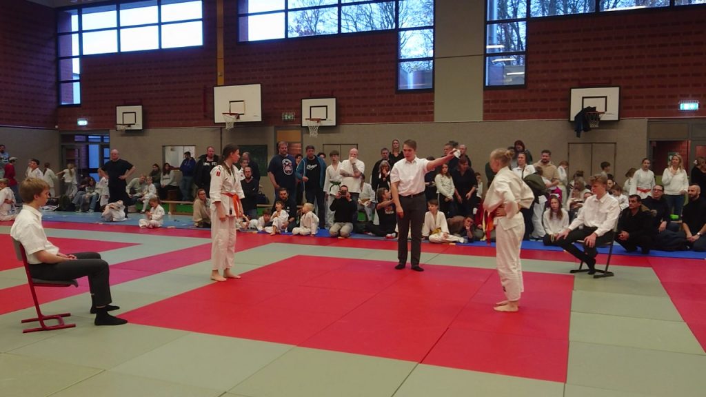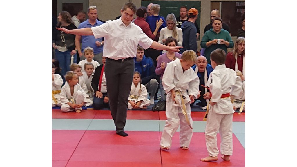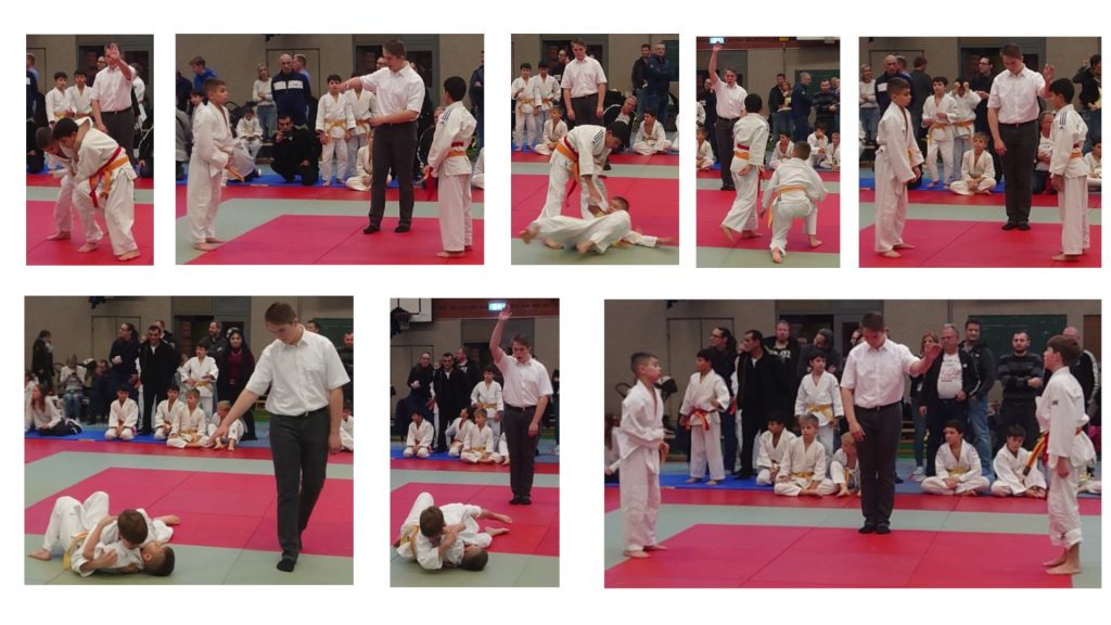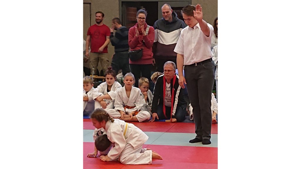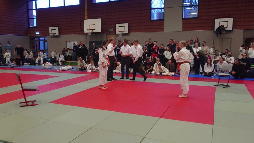 Behutsam und mit ganz viel Feingefühl leiteten sie die Kämpfe auf ihren Matten. Dabei galt es gerade bei den Kleinen, so manche Träne zu trocknen oder auch die Wettkampfregeln im Einzelnen zu erläutern ohne dabei gleich mit einem Shido (Strafe) aufzuwarten. Oft musste auch beim Gürtelbinden unterstützt und das korrekte Betreten und Verlassen der Wettkampffläche wiederholt werden.